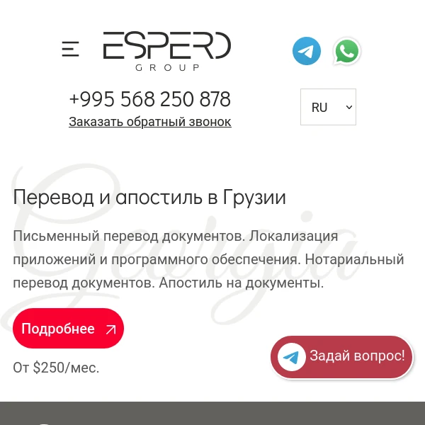Эксперты компании Эсперо помогли мне правильно подготовить все необходимые документы, провели регистрацию бизнеса в соответствии с законодательством Грузии. Я был приятно удивлён их индивидуальным подходом к каждому клиенту и оперативным решением любых возникающих вопросов.